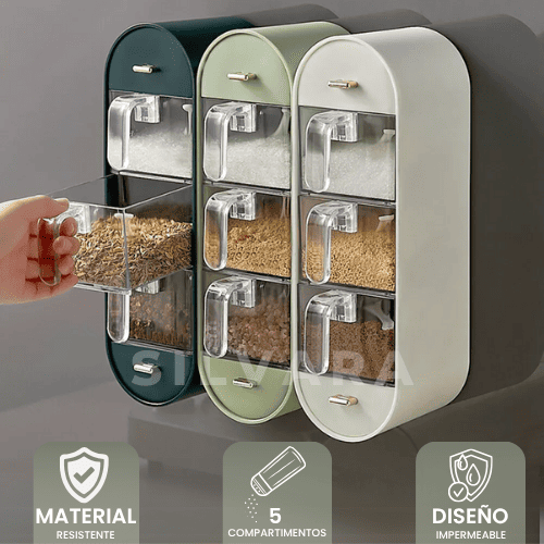 🧂Incluye: 5 compartimentos para almacenar y 3 cucharitas