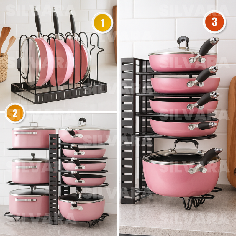Puede organizar hasta 8 ollas, sartenes o tapas de distintos tamaños, gracias a sus compartimentos ajustables.